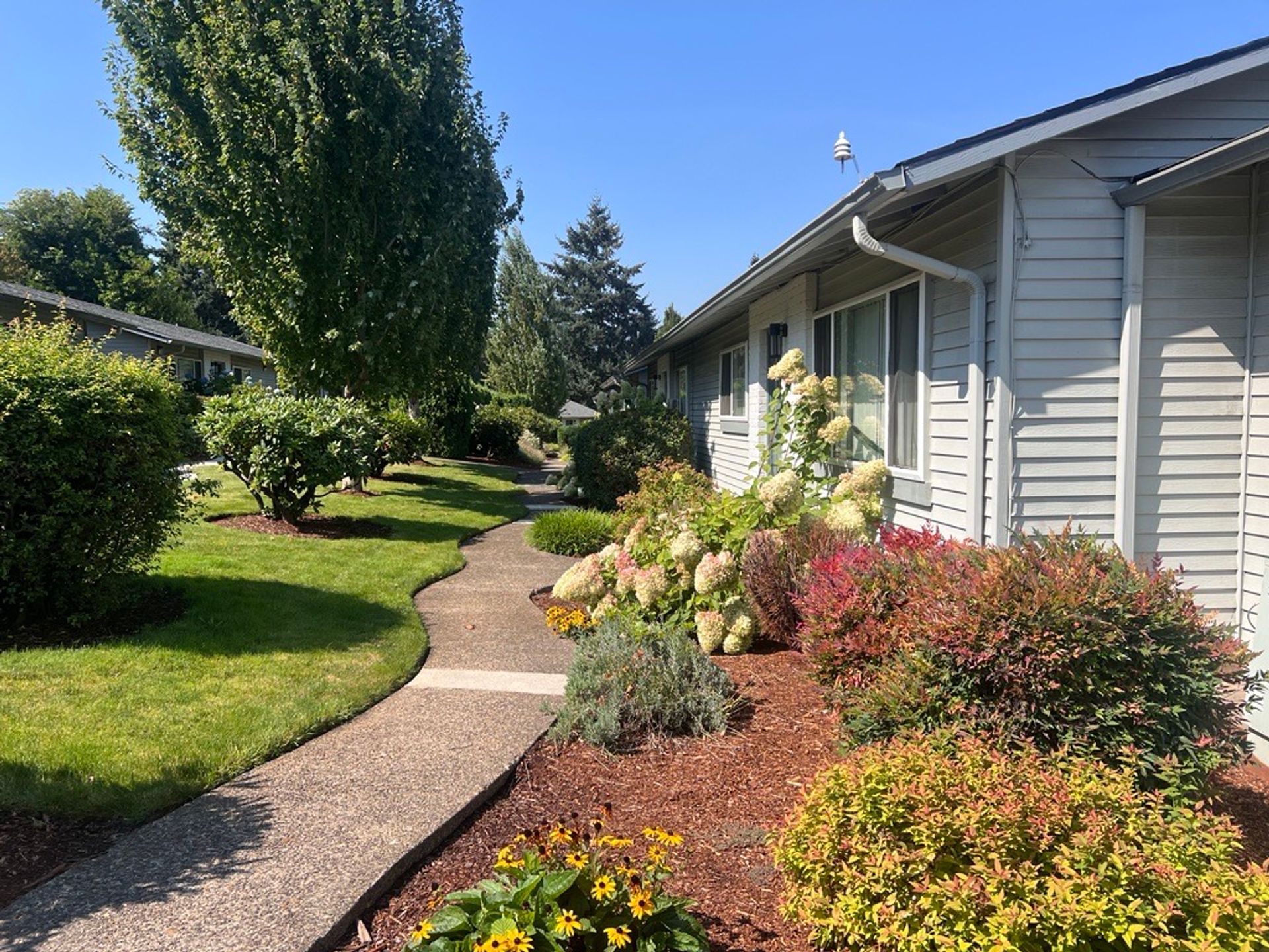 Located in historic Oregon City, Pleasant Square is a community of single-level duplexes tucked away on our stunningly landscaped property. It reminds us of the gardens in Alice in Wonderland!